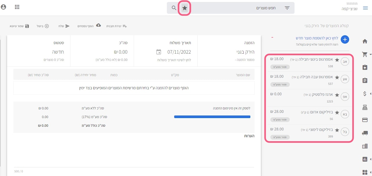 לחיצה על האייקון של הכוכב ⭐ בשורת החיפוש תבטל את הסינון וצפייה במוצרים מועדפים בלבד ותחזיר את הקטלוג המלא.
